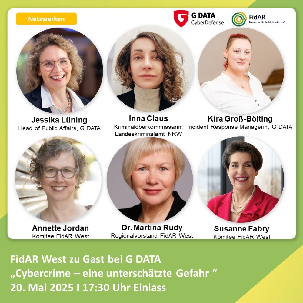 am 20. Mai 2025, Einlass 17:30 Uhr auf dem G DATA Campus, Königsallee 178 a, 44799 Bochum.Cybercrime ist zu einem lukrativen Business geworden und verursacht mittlerweile einen erheblichen wirtschaftlichen Schaden. Wie können sich Firmen besser schützen? Was tun, wenn „das Kind schon in den Brunnen gefallen ist“? Und was bedeutet dies für Vorständinnen und Aufsichtsrätinnen?