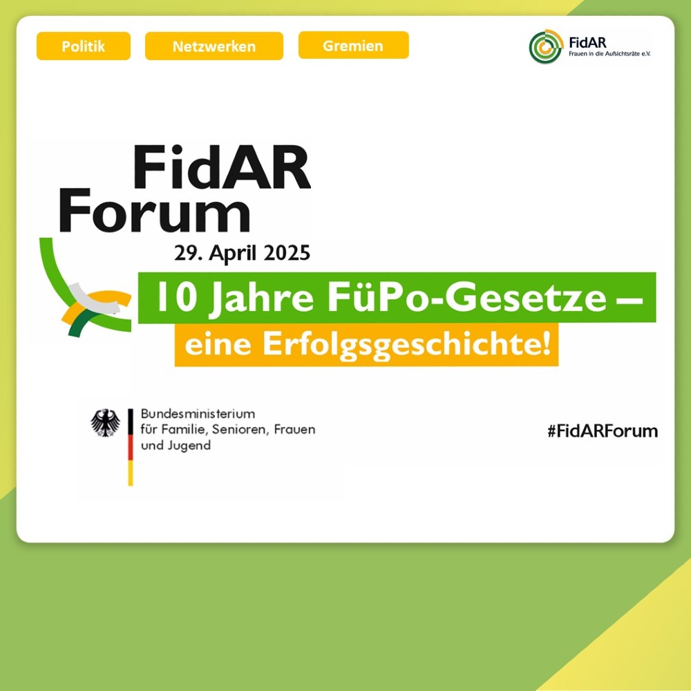 Wir freuen uns, zum FidAR-Forum 2025 „10 Jahre Führungspositionen-Gesetze – Eine Erfolgsgeschichte!“ nach Berlin-Mitte einzuladen.Check-In: ab 13:15 Uhr Während des gesamten FidAR-Forums bieten sich von Beginn an vielfältige Möglichkeiten zum Netzwerken. Das Fachprogramm startet ab 13:45 Uhr. Im Fachprogramm können Sie an 60-minütigen Experts Talks teilnehmen, in denen in Vorträgen und Gesprächsrunden aktuelles Aufsichtsrats-Know How vertieft wird. Die Angebote werden von den FidAR-Fördermitgliedern BWI, CMS, Deloitte, Forvis Mazars und Page Executive gestaltet.